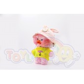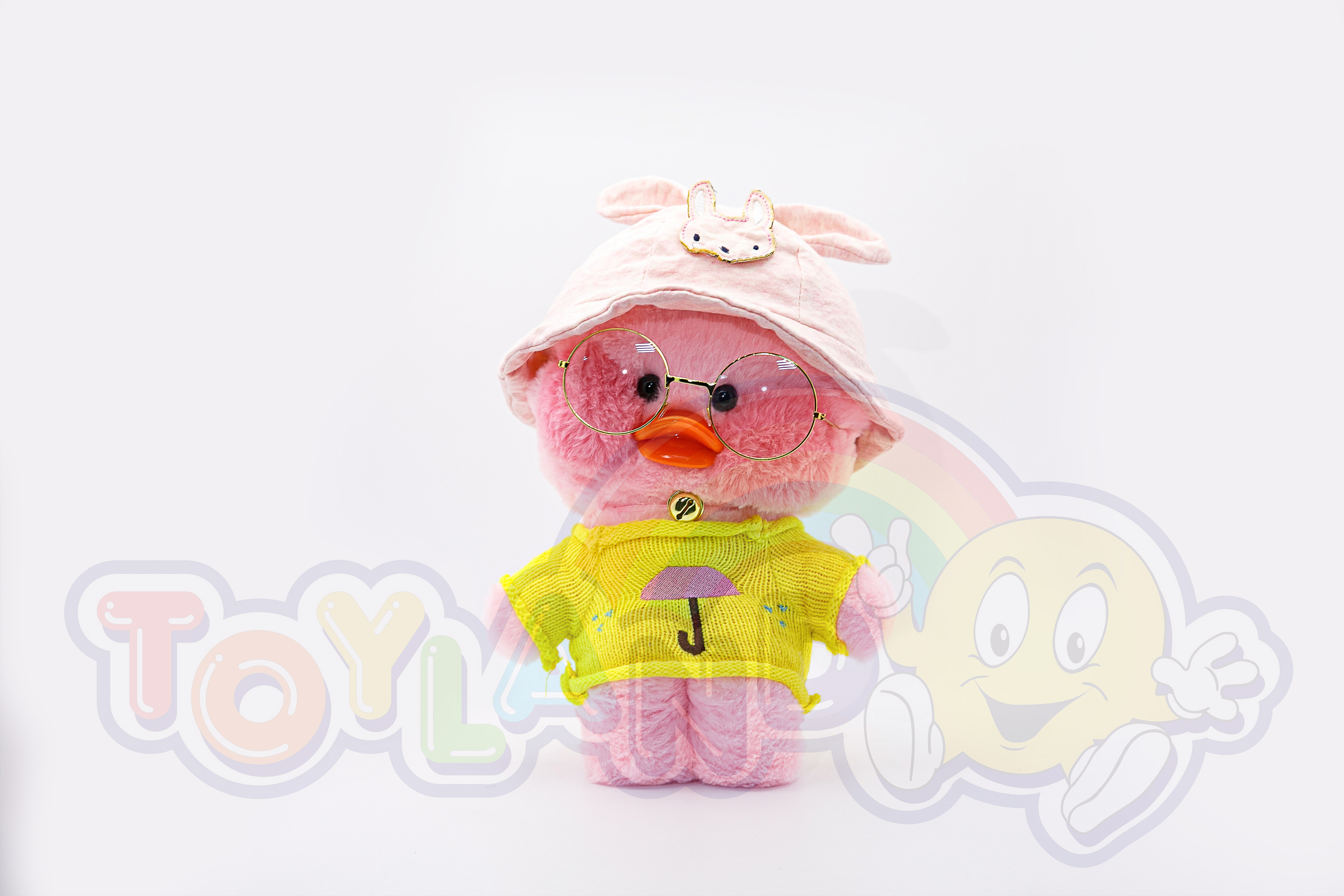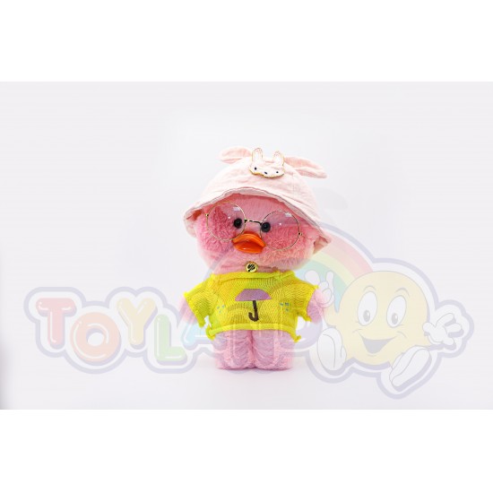 Утенок LaLafanfan - милая плюшевая игрушка со стильной одеждой (очки в золотой оправе, ожерелье, желтая одежда и шляпа).