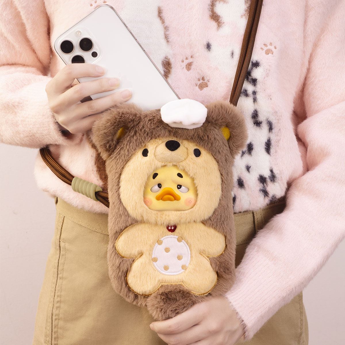 Сумка выполнена в виде забавного утенка из серии Upset Duck с выразительными деталями и мягкой текстурой. Внутренняя часть достаточно вместительная, чтобы хранить телефон, ключи, наушники и другие необходимые мелочи. Регулируемый ремень позволяет носить сумку как через плечо, так и кросс-боди - удобно и модно.