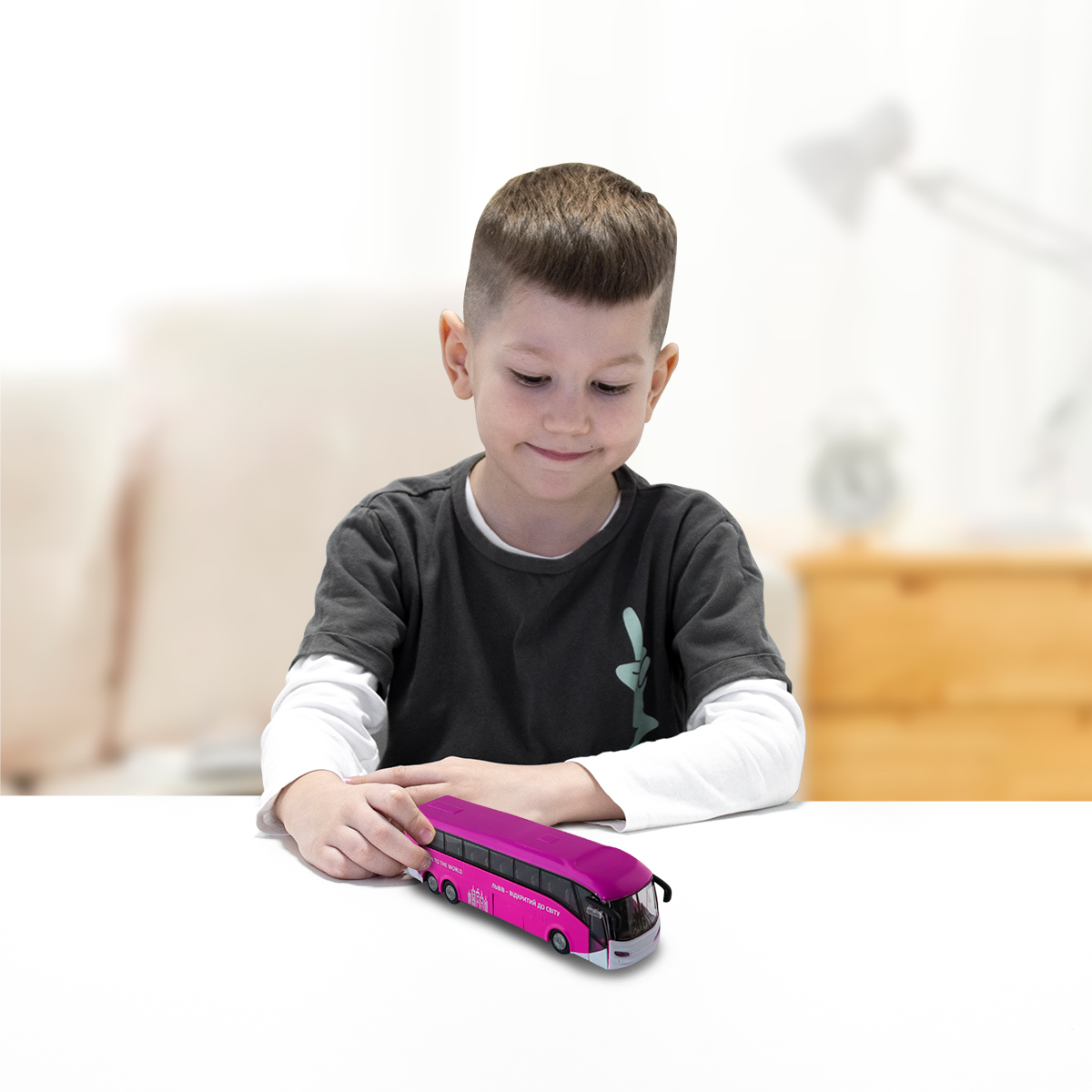 Автобус изготовлен из прочных материалов - пластика и металла - и имеет аккуратную проработку деталей. Эта модель идеально подходит как для коллекций, так и для декора или игры, привлекая внимание как детей, так и взрослых любителей транспорта.
