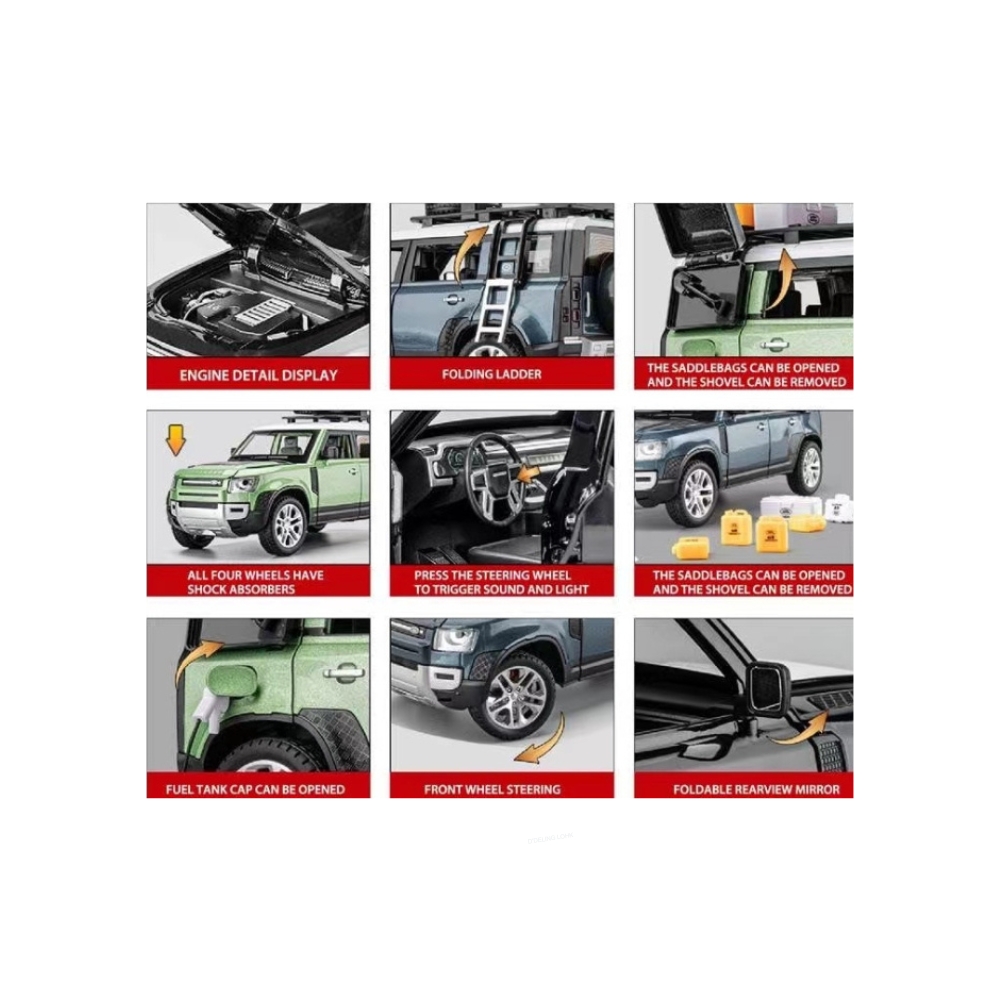 Модель автомобиля Land Rover Defender впечатляющий предмет коллекционирования для всех автолюбителей и коллекционеров. Модель оснащена функцией отката, что позволяет ее немного потянуть назад и она будет двигаться сама, выполнена в масштабе 1:24, все двери открываются. Он изготовлен из прочного металла и оснащен функциональными звуками и подсветкой, что делает его суперинтерактивной игрушкой.