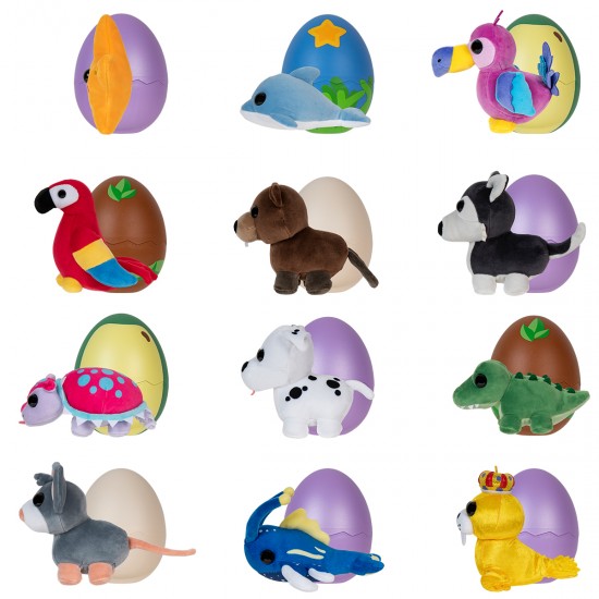 Подарите жизнь удивительным животным в популярной игре Adopt Me! Распакуйте и откройте яйцо и познакомьтесь со своим новым мягким другом! Какое животное вам нравится больше всего? Эти коллекционные плюшевые животные варьируются от обычных до легендарных и идеально подходят для игр, обнимашек и веселья. Соберите их все!