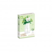 Собранная модель представляет собой белый букет с зелеными и желтыми акцентами, помещенный в элегантную белую вазу.