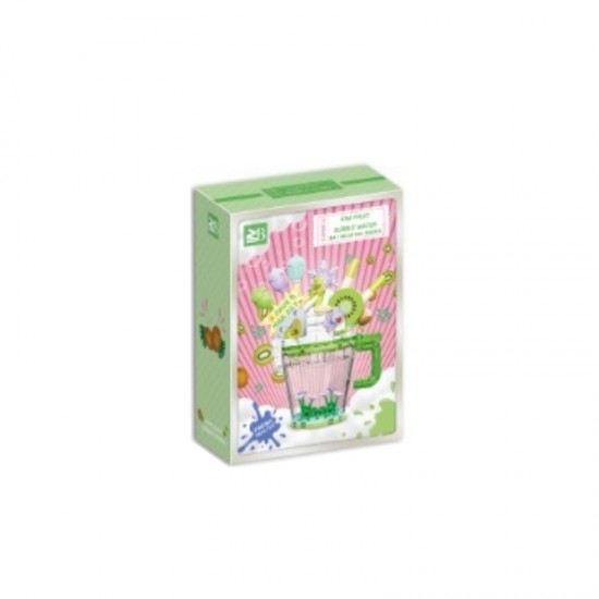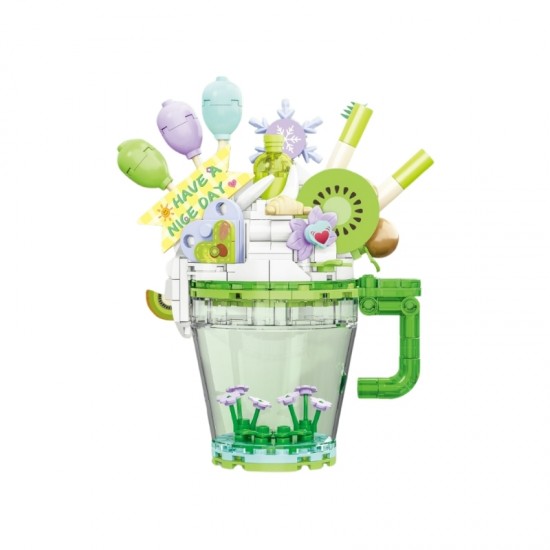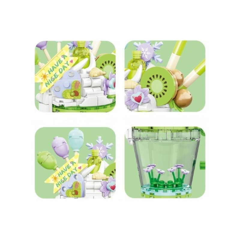 Этот оригинальный конструктор сочетает в себе цветочную тематику и элементы фруктового декора, создавая миниатюрную композицию в форме прозрачного стакана с объемными деталями.