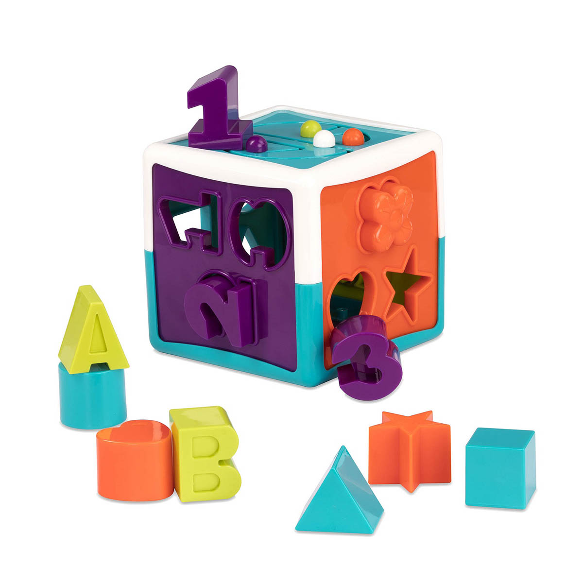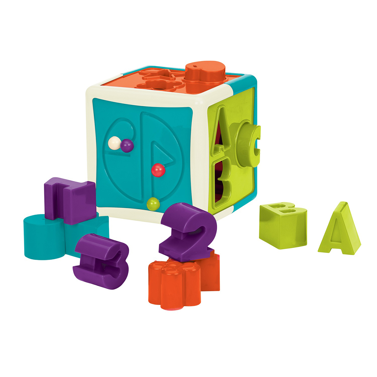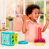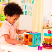 Образовательная игрушка Smart Cube Battat представляет собой интерактивный развивающий куб, который предлагает детям увлекательный способ учиться через игру. Этот сортер форм помогает малышу узнавать геометрические фигуры, буквы и цифры, а также развивает мелкую моторику, когда ребенок подбирает элементы и передвигает бусины по лабиринту.