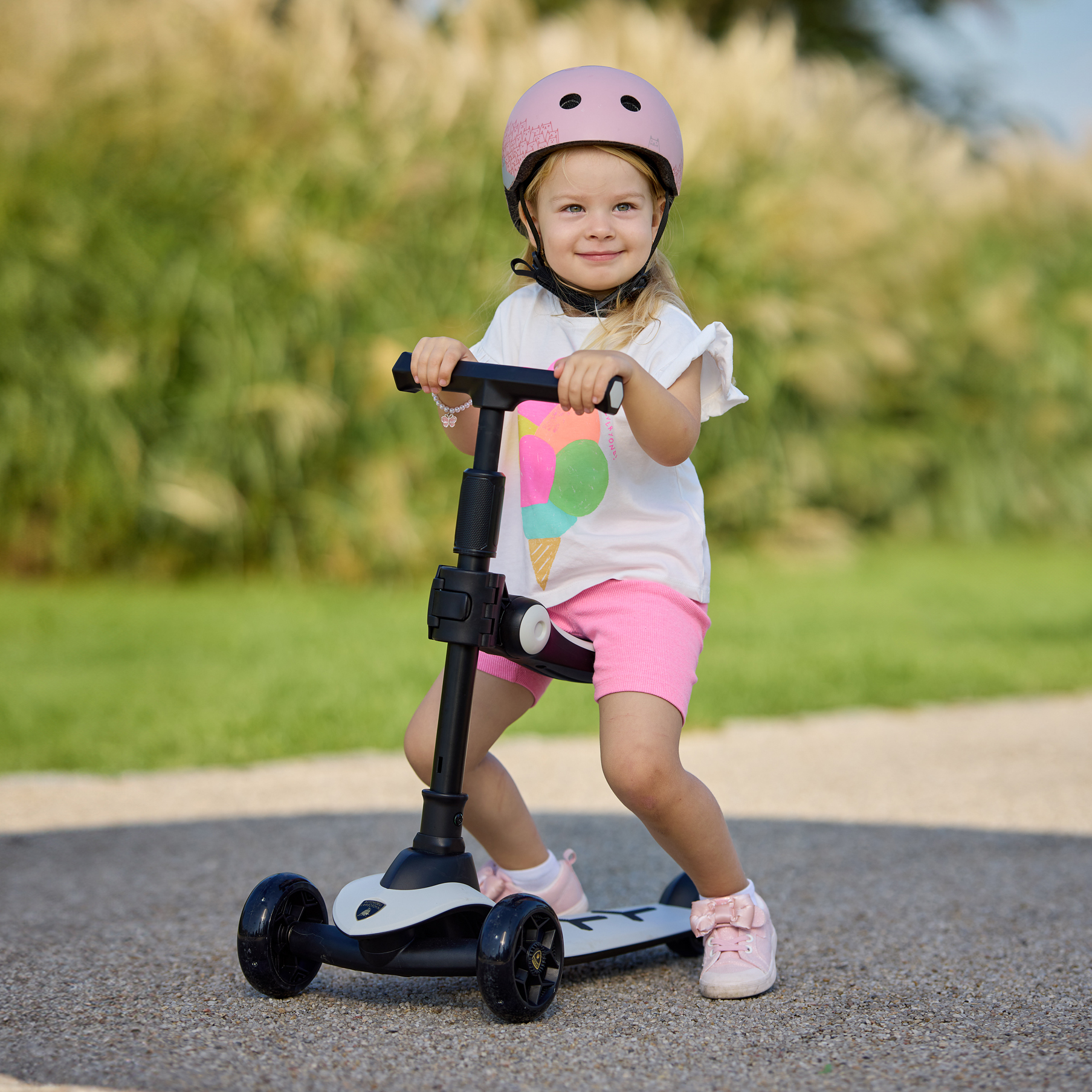 Высота эргономичного сиденья регулируется, поэтому самая низкая позиция подходит даже для малышей, которые недавно начали ходить. Когда ребенок подрастет, сиденье можно снять без использования инструментов, и самокат превращается в классическую модель.