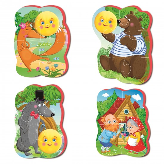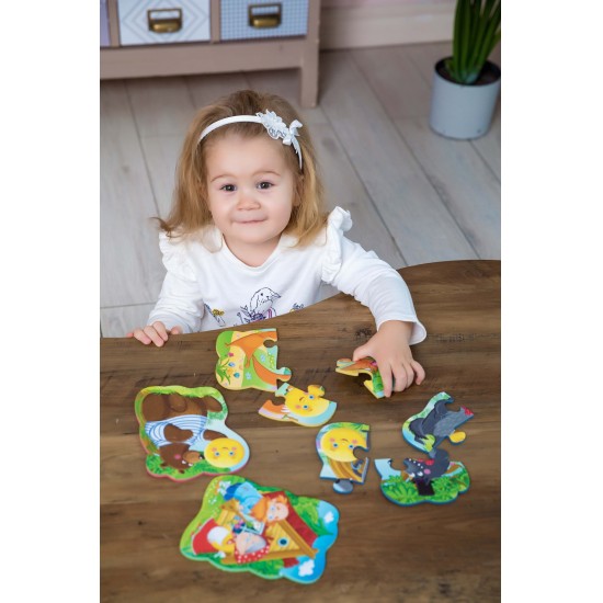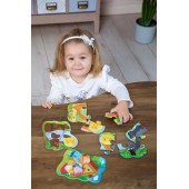 Мягкие объемные детали из вспененного полимера. Пазлы разделены на 3-5 элементов. Возраст 2-3 года. Вид упаковки: пакет с клапаном. Особенность: в 1 упаковке - 4 пазла.