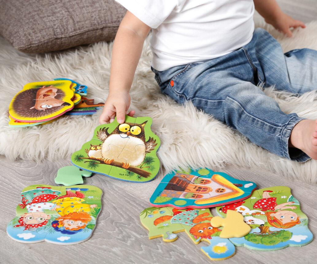 Мягкие объемные детали из вспененного полимера. Пазлы разделены на 3-5 элементов. Возраст 2-3 года. Вид упаковки: пакет с клапаном. Особенность: в 1 упаковке – 4 пазла.