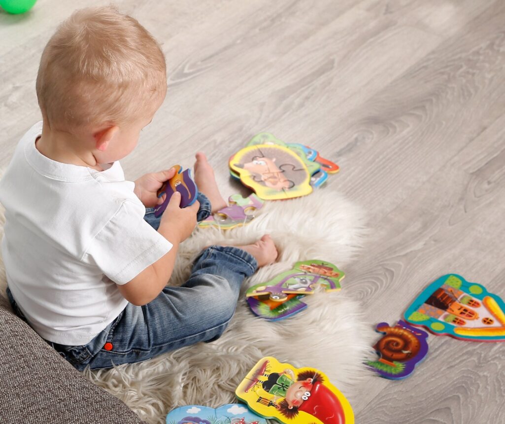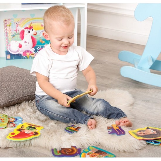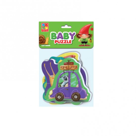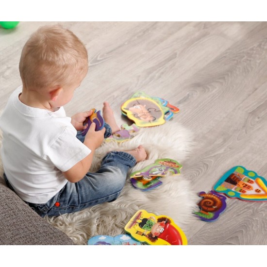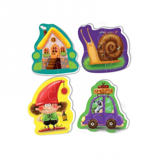 Мягкие объемные детали из вспененного полимера. Пазлы разделены на 3-5 элементов. Возраст 2-3 года. Вид упаковки: пакет с клапаном. Особенность: в 1 упаковке – 4 пазла.