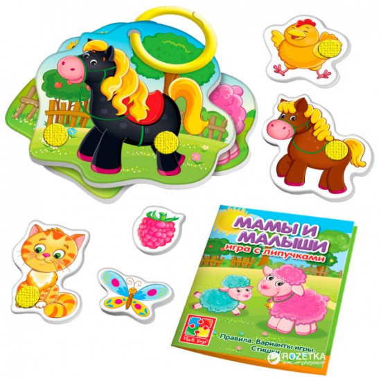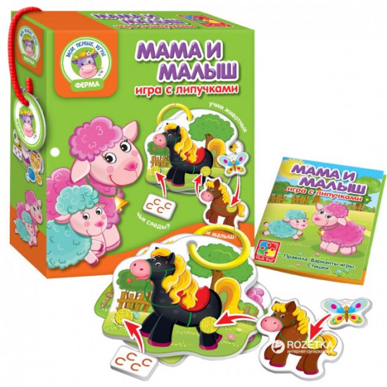 Первая игра с липучками для малышей. Добрые животные дадут малышу понимание важной темы "Мама и малыш", помогут определять следы и просто весело провести время. Игра удобна и интересна. Животных можно закрепить на кольце и взять с собой на прогулку. Комплектация: игровые поля – 6 шт., игровые фишки – 18 шт, липучки - 18 шт, пластиковое кольцо - 1 шт, инструкция. Размер коробки: 180*210*50 мм. Возраст: для самых маленьких. Язык: русский.Изготовленo из картона и бумаги.