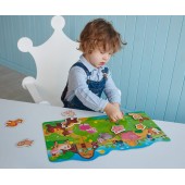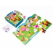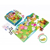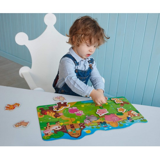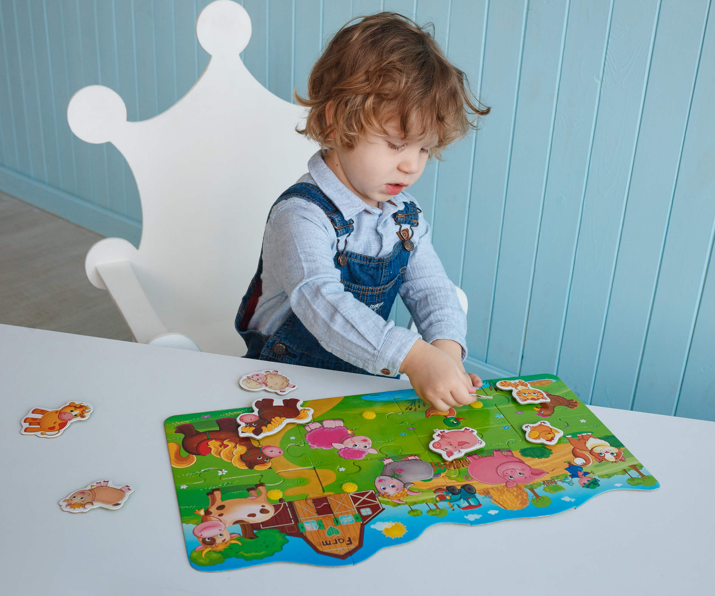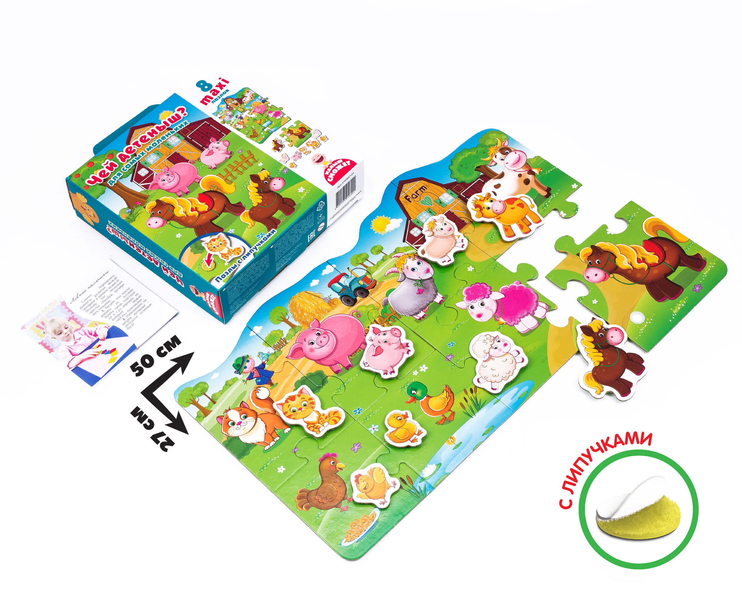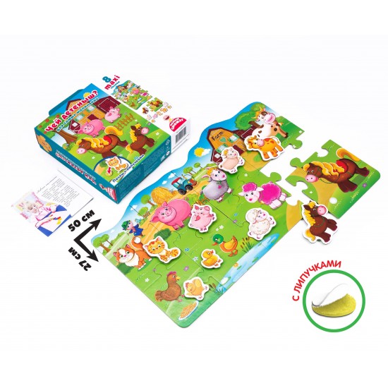 Складываем пейзаж фермы. Крепим детенышей рядом со взрослыми животными. Игра на развитие логики, восприятия, речи и мелкой моторики. Особенности: плотный картон, использование липучек. Комплектация: 8 пазловых деталей, 8 картонных фигурок, 8 желтых и 8 белых липучек. Размер коробки: 210*55*250 мм. Язык: русский. Возраст: 1-3 года.